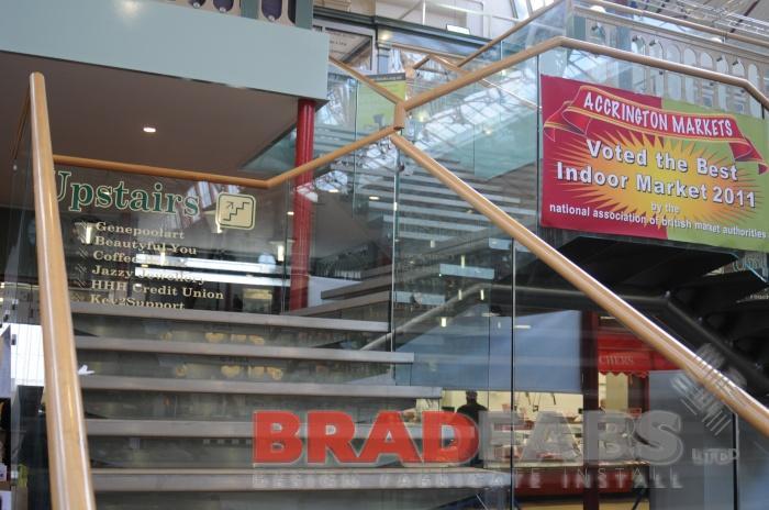 Steel Fabricators of Balconies, Staircases. Three teired glass and steel staircase installed in acrington market hall in Lancashire, fabricated and delivered throughtout the UK